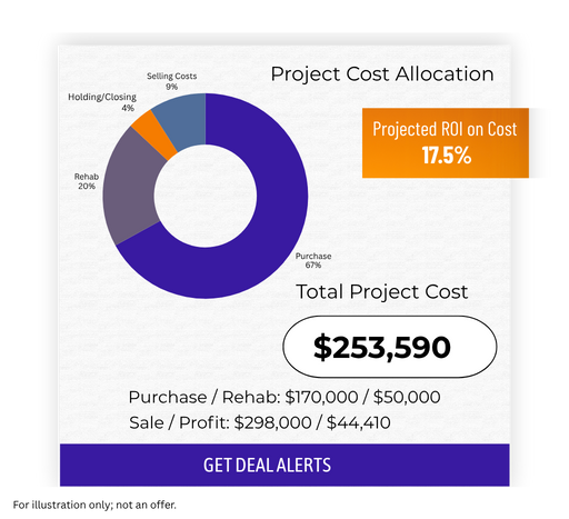 Each deal includes a one-page brief—purchase, rehab (CapEx), holding/selling costs, profit and ROI—so you can decide fast.