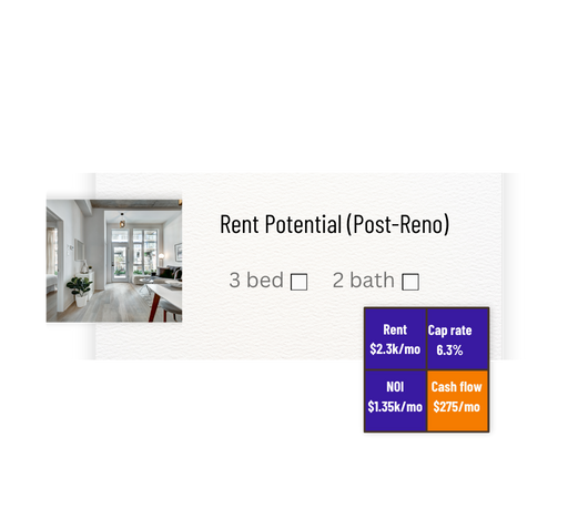 Every brief shows realistic rent potential after rehab plus cap/NOI/cash flow, calculated with taxes, insurance, management, and vacancy.